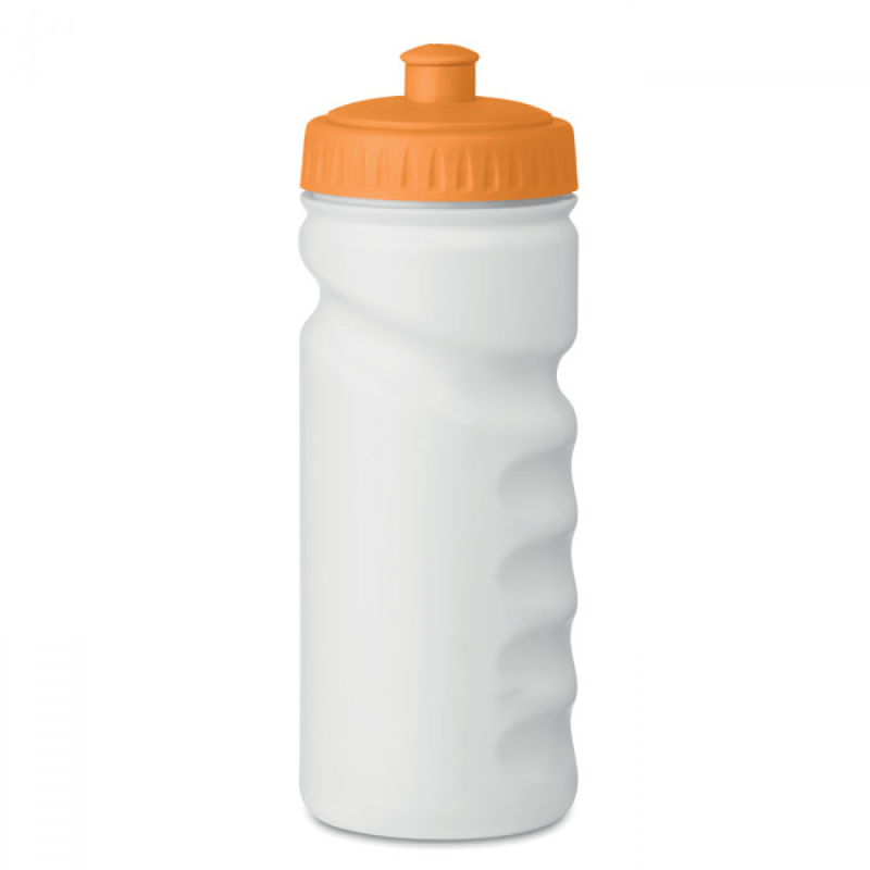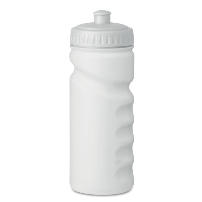 Sportovní láhev s tvarováním pro pohodlné držení. Vyrobeno z tvrdého PE plastu bez BPA. Objem 500 ml. Neteče.