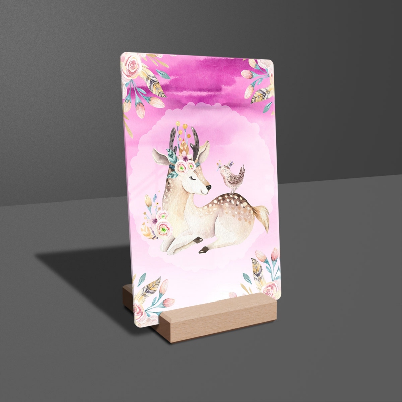 Na produktovém fotu vyobrazena nejoblíbenější varianta akrylového skla 14x21/21x14cm a dřevěný stojánek 10x10cm.
