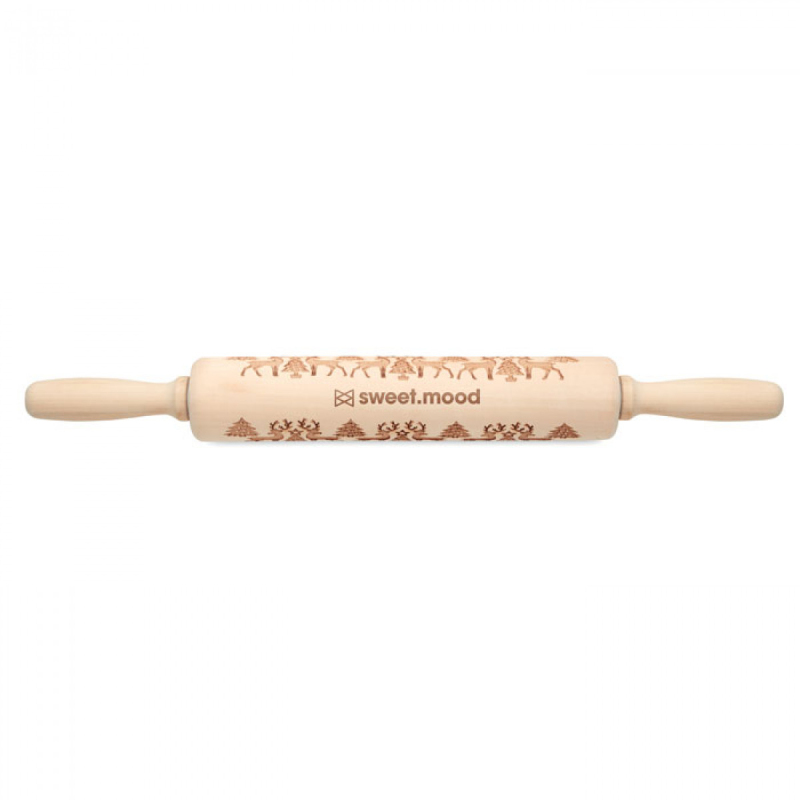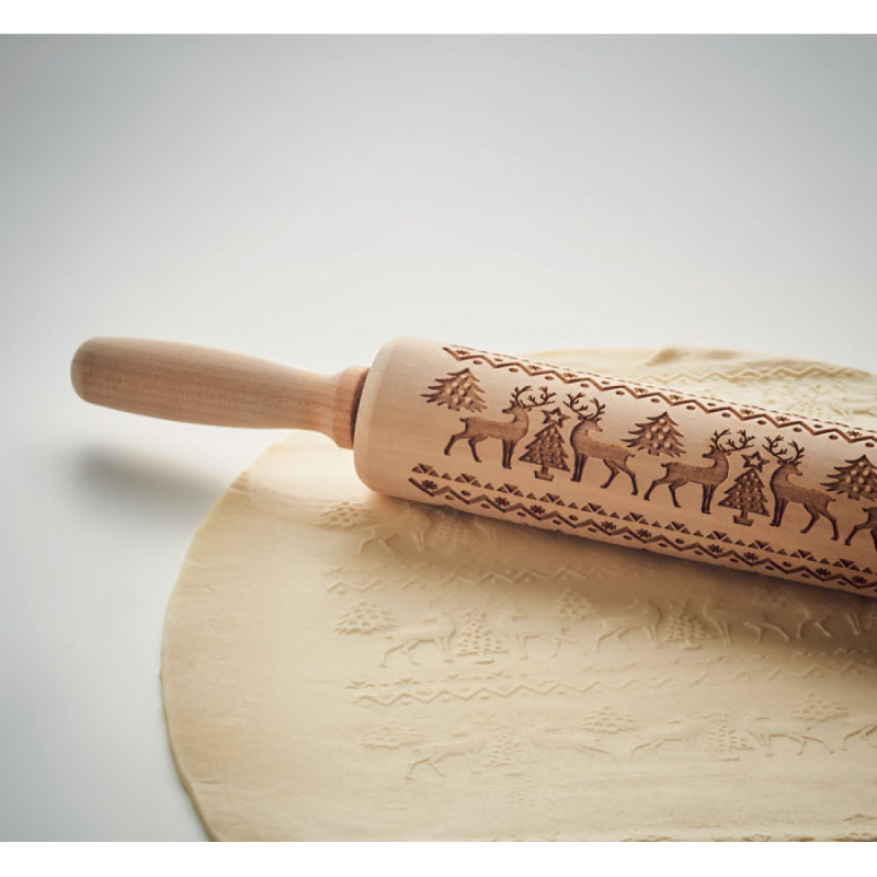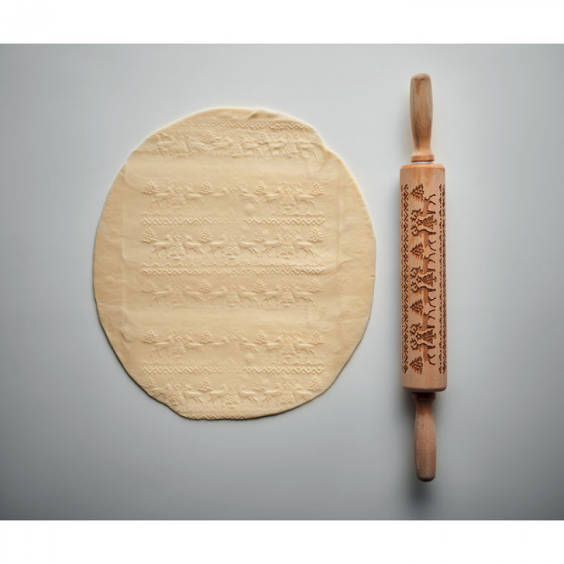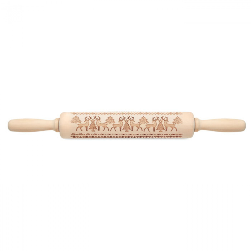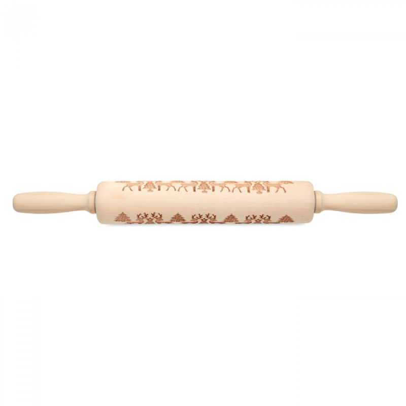 Dřevěný váleček na pečivo s reliéfním vánočním vzorem.