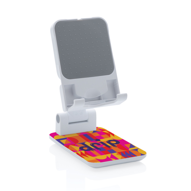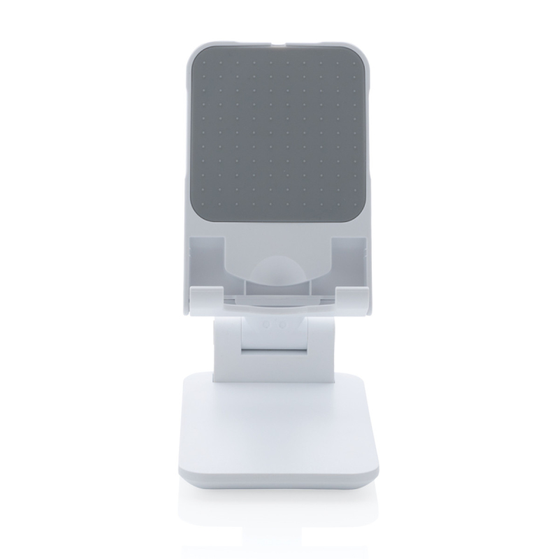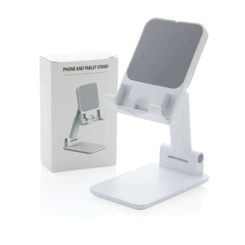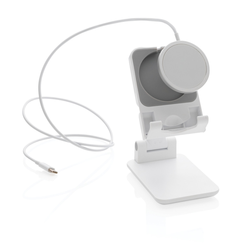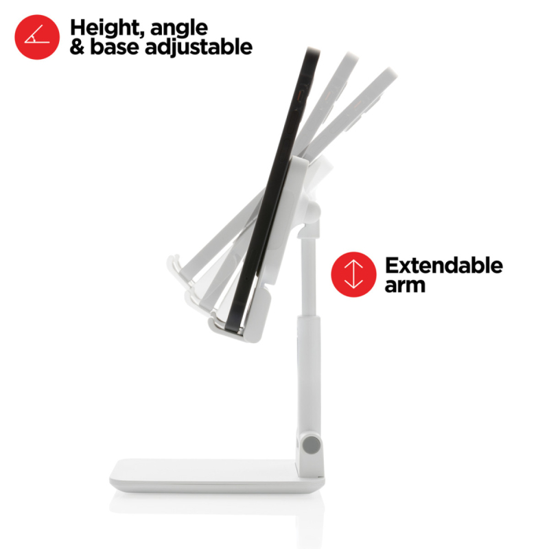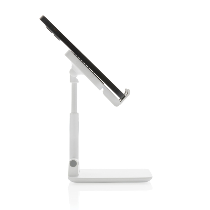 Pevný stabilní stojánek na telefon nebo tablet vyrobený z ABS. Přizpůsobitelná výška, silikonové prvky pro vyšší stabilitu a zabránění poškrábání zařízení. Silikonová část lze uzpůsobit pro vložení originální MagSafe nabíječky. Pevný podstavec zajišťující stabilitu.
