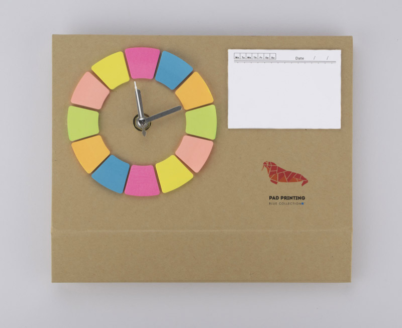 POSIT jsou perfektní stolní hodiny. Tradiční čísla na ciferníku byla nahrazena lepivými poznámkovými kartami (25 ks / každá barva), které nám umožňují vkládat informace o důležitých schůzkách přímo na ciferníky nebo je používat tradičním způsobem - označovat důležité dokumenty. Vedle hodin je k dispozici 12 listů poznámkového bloku, které vám umožní zapsat si nejdůležitější informace, které chcete mít vždy na dohled. Všechno je vyrobeno z silné lepenky v přirozené barvě.