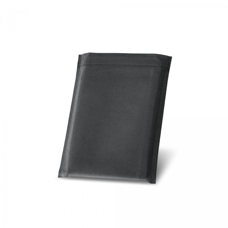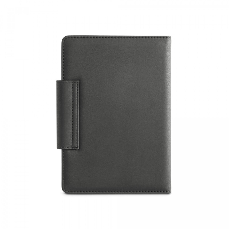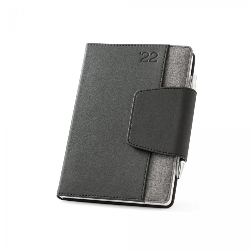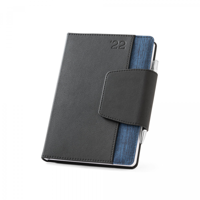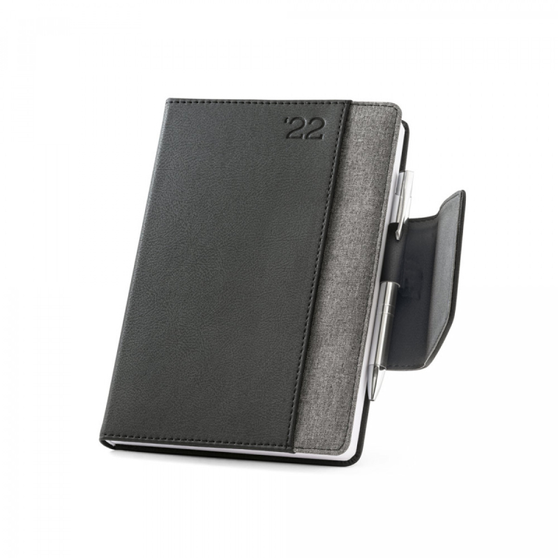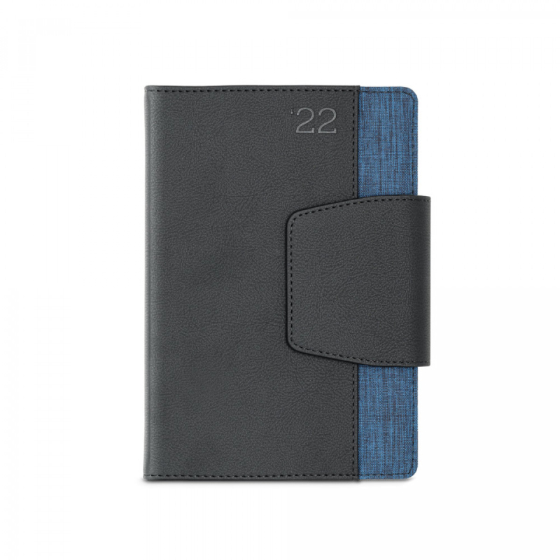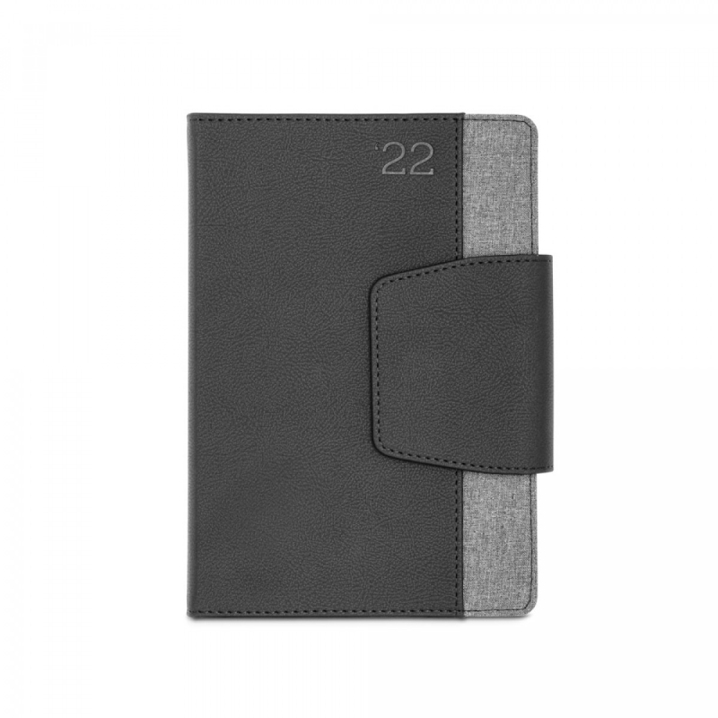 A5 diář z dvou materiálů - polyuretanu (PU) a polyesterové, látky. Je organizován do denního plánu. Má magnetické, uzavření, přední kapsu, držák na kuličkové, pero (součást balení) a stuhu na označení stránky. Dodává se s netkaným obalem. 148 x 210 mm | Obal: 205 x 250 mm