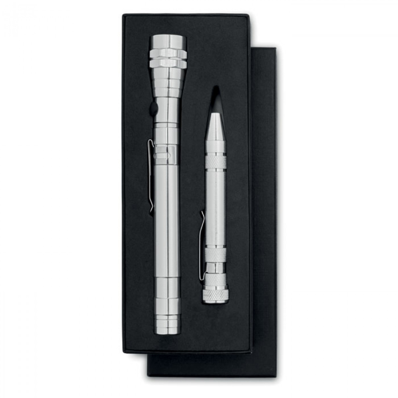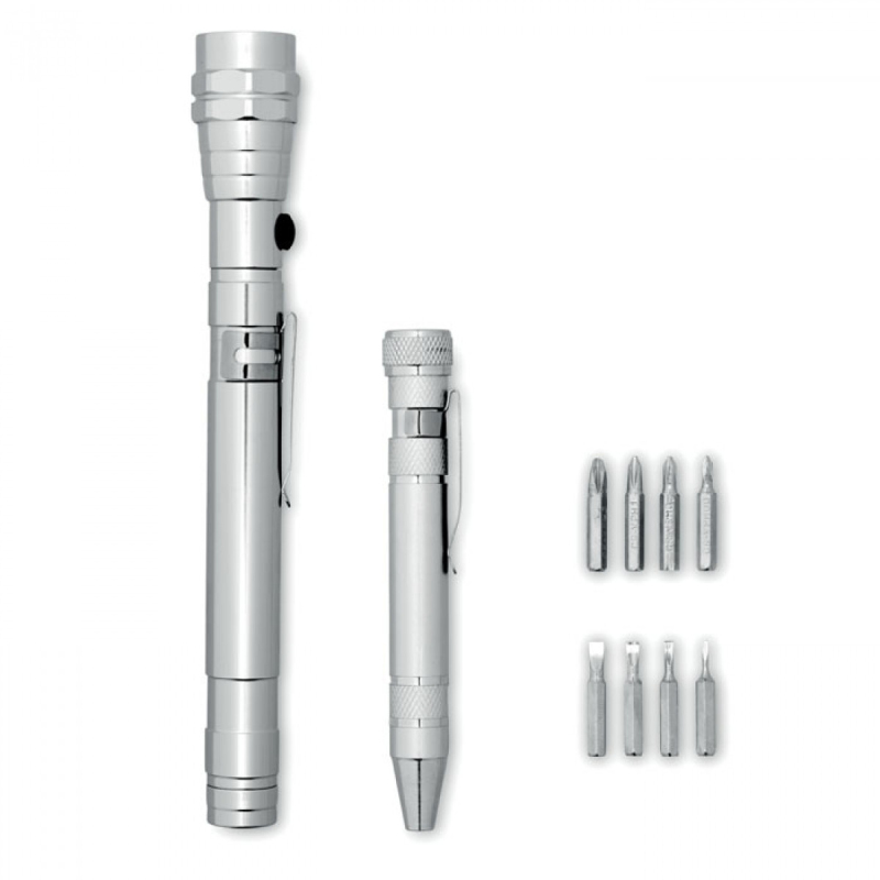 Set hliníkové svítilny s 3 LED žárovkami a hliníkové nářadí ve tvaru tužky. Přiloženy 4 LR44 baterie. Dodáváno v krabičce.