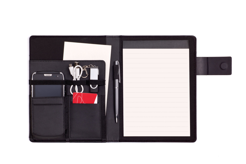 Modré designové portfolio (konferenční desky) s magnetickým zapínáním, včetně poznámkové knihy A5 (20 listů). Příslušenství (kromě bloku) není součástí produktu.
