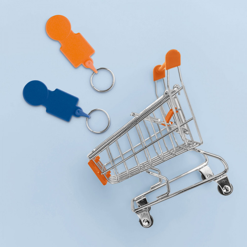 Klíčenka z PS ve tvaru mince - použitelná do vozíků v supermarketech. 25 x 60 x 2 mm