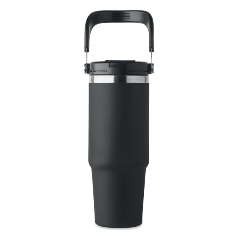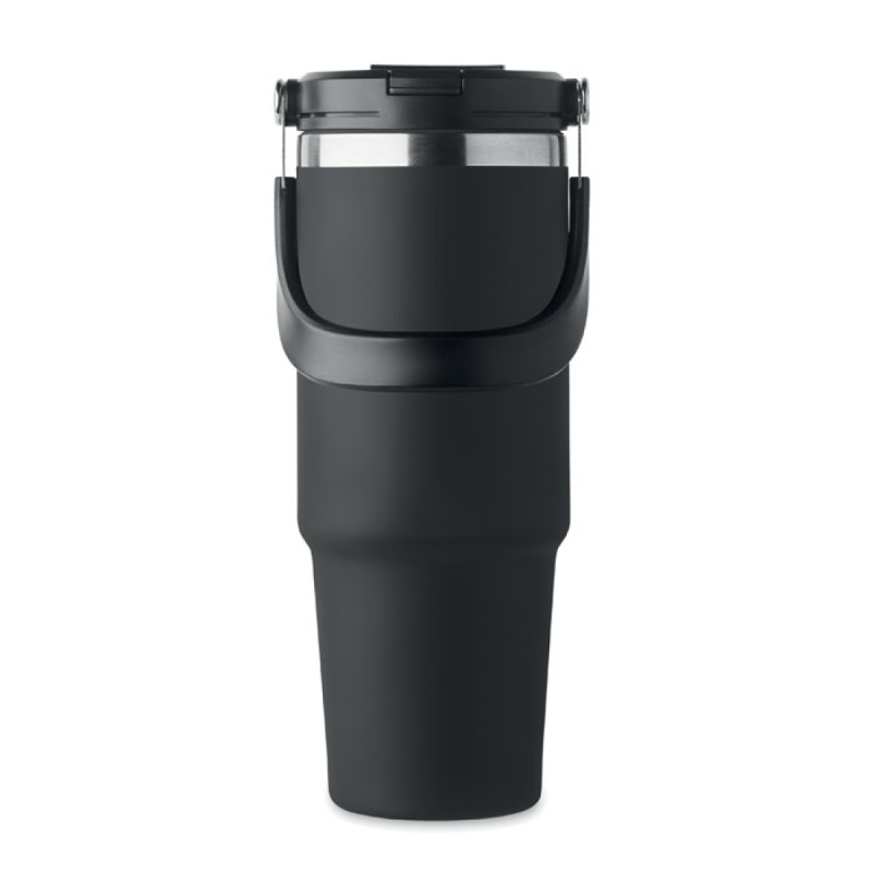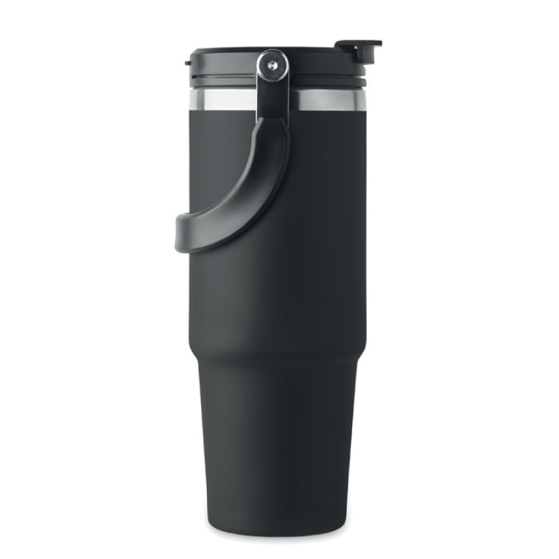 Dvoustěnný hrnek z recyklované nerezové oceli (90 % recyklované nerezové oceli a 10 % nerezové oceli) s víčkem s vnitřním brčkem a otvorem pro přímé pití. Rukojeť pro přenášení. Objem 850 ml.