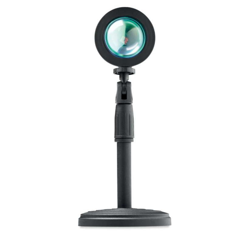 Vícebarevná projekční otočná lampa z ABS. Šestnáct barev, zábleskový, stroboskopický a plynulý režim. Včetně nabíjecího kabelu USB, stojánku a dálkového ovládání.