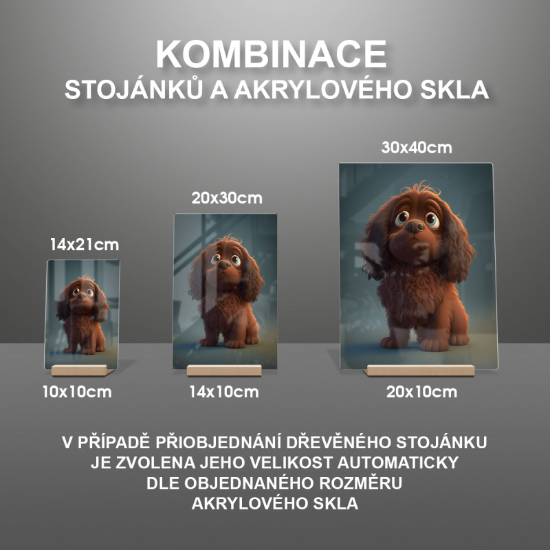 Na produktovém fotu vyobrazena nejoblíbenější varianta akrylového skla 14x21cm a dřevěný stojánek 10x10cm.