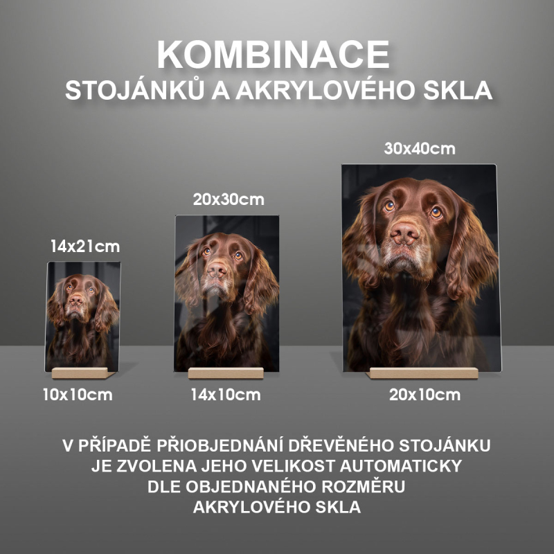 Na produktovém fotu vyobrazena nejoblíbenější varianta akrylového skla 14x21cm a dřevěný stojánek 10x10cm.