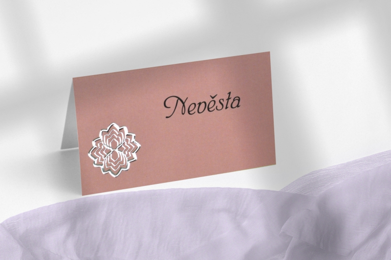 Jmenovka na svatební stůl s moderním designem. Tisk na kvalitním papíru v gramáži 300g/m2 s povrchovou úpravou matného soft touch lamina.
