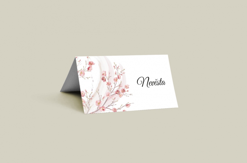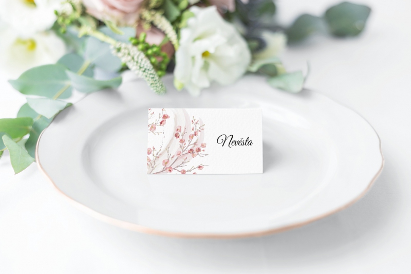 Jmenovka na svatební stůl s moderním designem. Tisk na kvalitním papíru v gramáži 300g/m2 s povrchovou úpravou matného soft touch lamina.