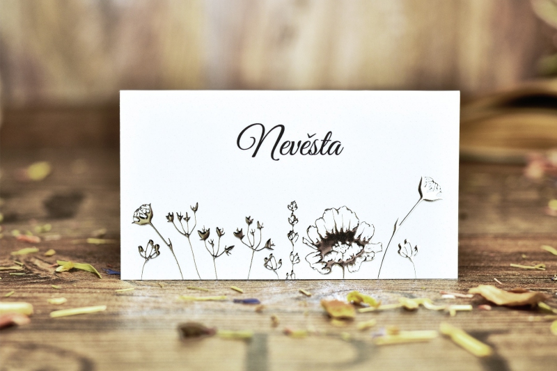 Jmenovka na svatební stůl s moderním designem. Tisk na kvalitním papíru v gramáži 300g/m2 s povrchovou úpravou matného soft touch lamina.