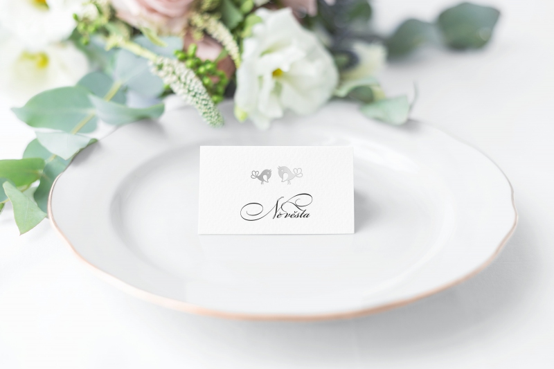 Jmenovka na svatební stůl s moderním designem. Tisk na kvalitním papíru v gramáži 300g/m2 s povrchovou úpravou matného soft touch lamina.
