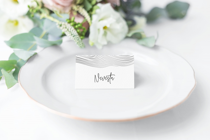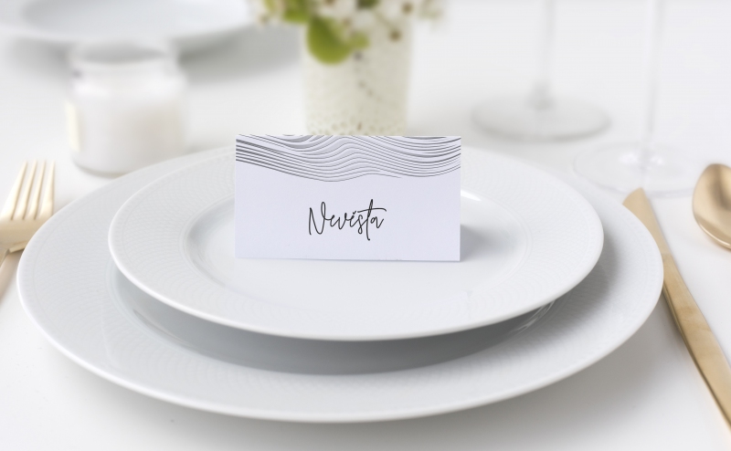 Jmenovka na svatební stůl s moderním designem. Tisk na kvalitním papíru v gramáži 300g/m2 s povrchovou úpravou matného soft touch lamina.