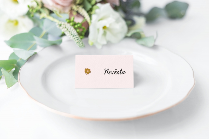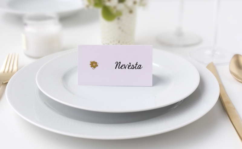 Jmenovka na svatební stůl s moderním designem. Tisk na kvalitním papíru v gramáži 300g/m2 s povrchovou úpravou matného soft touch lamina.
