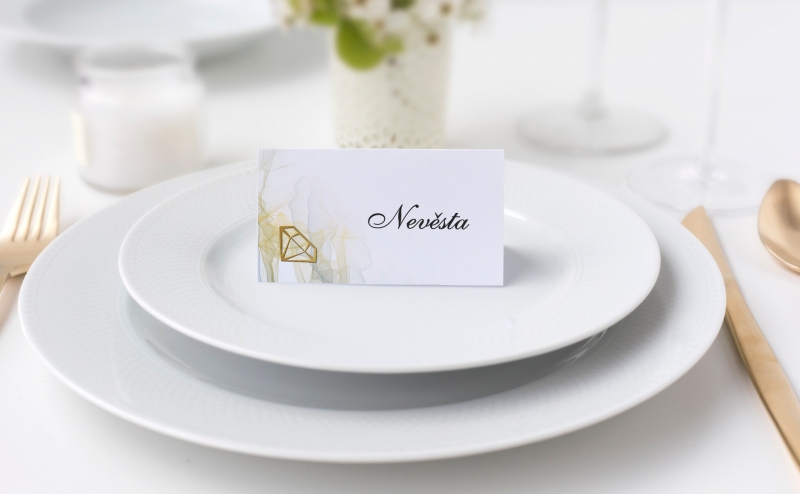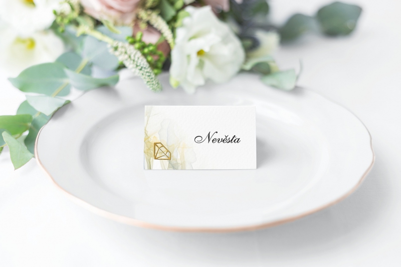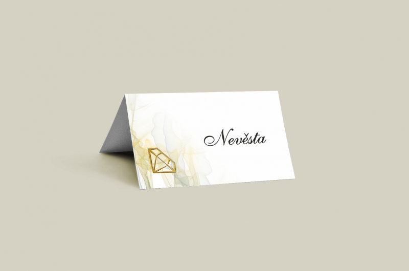 Jmenovka na svatební stůl s moderním designem. Tisk na kvalitním papíru v gramáži 300g/m2 s povrchovou úpravou matného soft touch lamina.