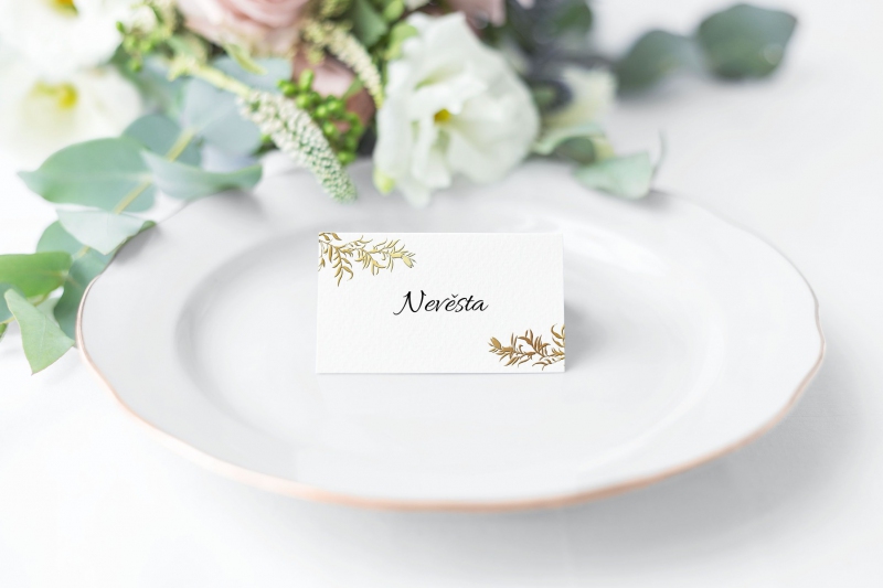 Moderní jmenovka na svatební stůl s elegantním designem, který vynikne na různobarevných grafických papírech. Krásné květinové motivy skvěle doplní Vaši svatební tabuli.