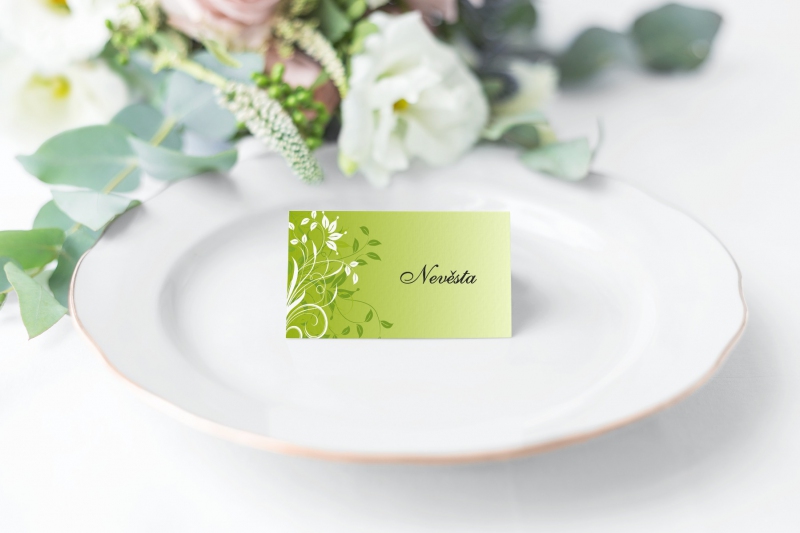 Moderní jmenovka na svatební stůl s elegantním designem, který vynikne na různobarevných grafických papírech. Krásné květinové motivy skvěle doplní Vaši svatební tabuli.