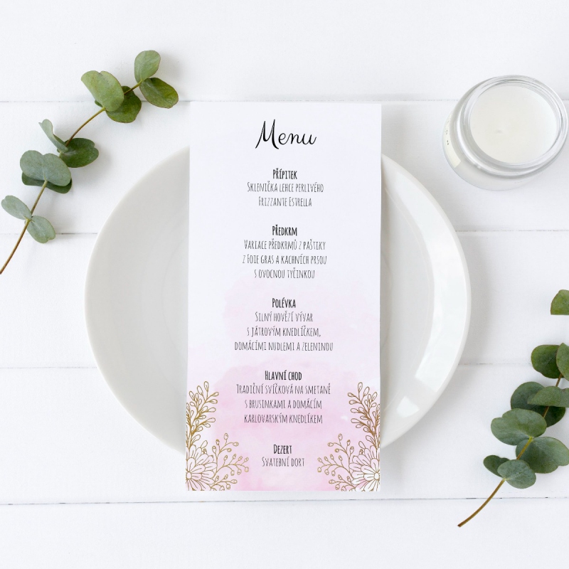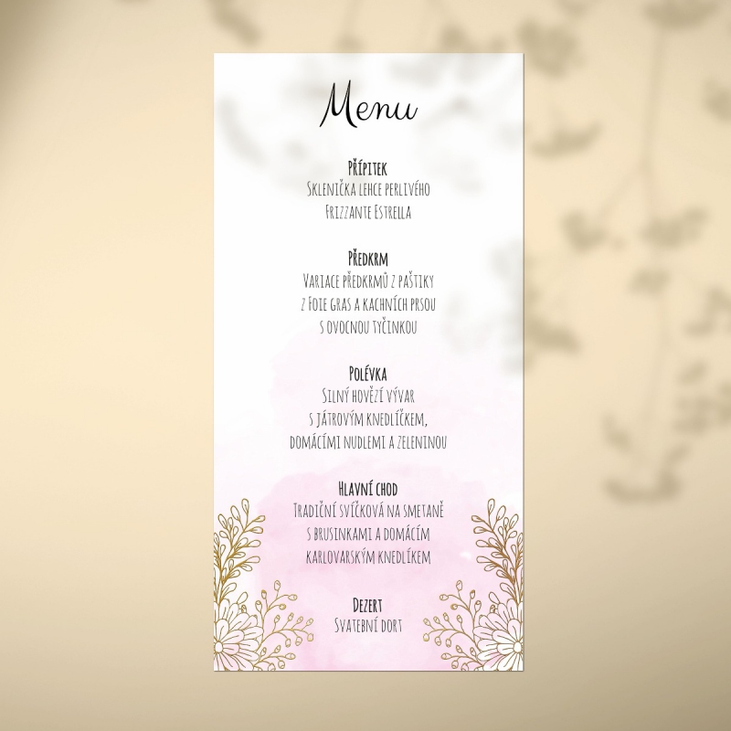 Originální svatební menu s moderními květinovými motivy, které krásně ozdobí Vaši svatební hostinu. Možnost výběru grafického papíru Vám umožní snadno sladit menu se svatebními barvami a vytvořit elegantní svatební tabuli.