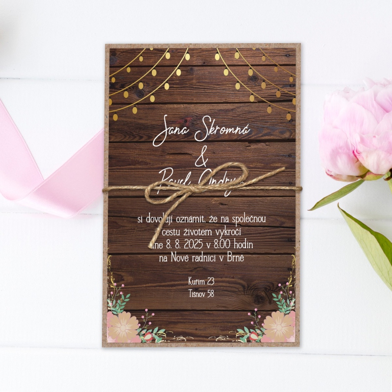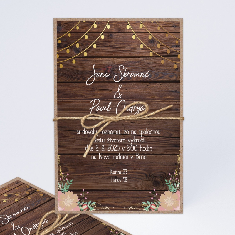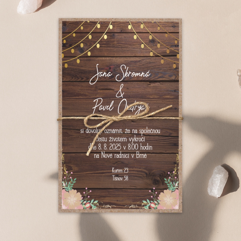 Originální svatební oznámení s moderním designem, s povrchovou úpravou matného soft touch lamina, podlepené kartonem a převázané šňůrkou.