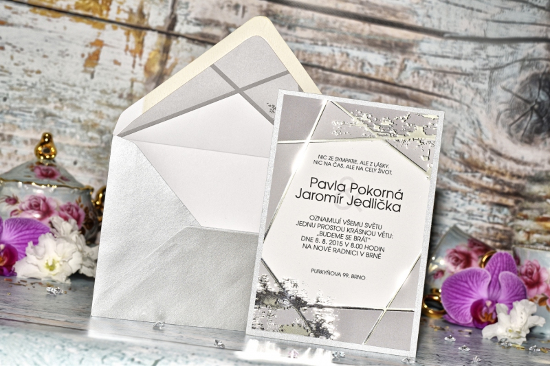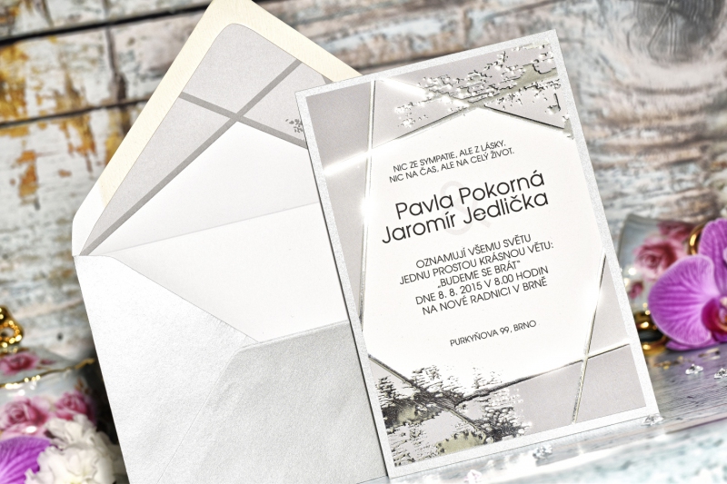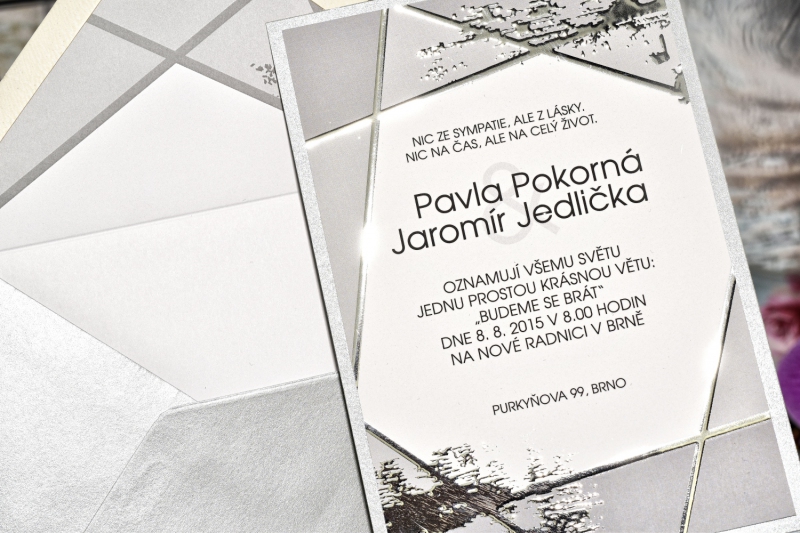 Originální svatební oznámení s moderním designem, s povrchovou úpravou matného soft touch lamina, podlepené kartonem.