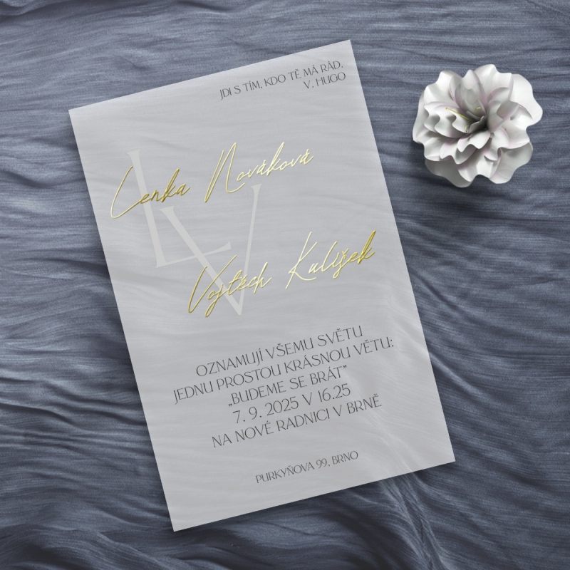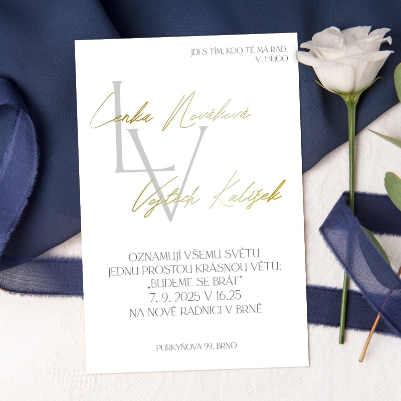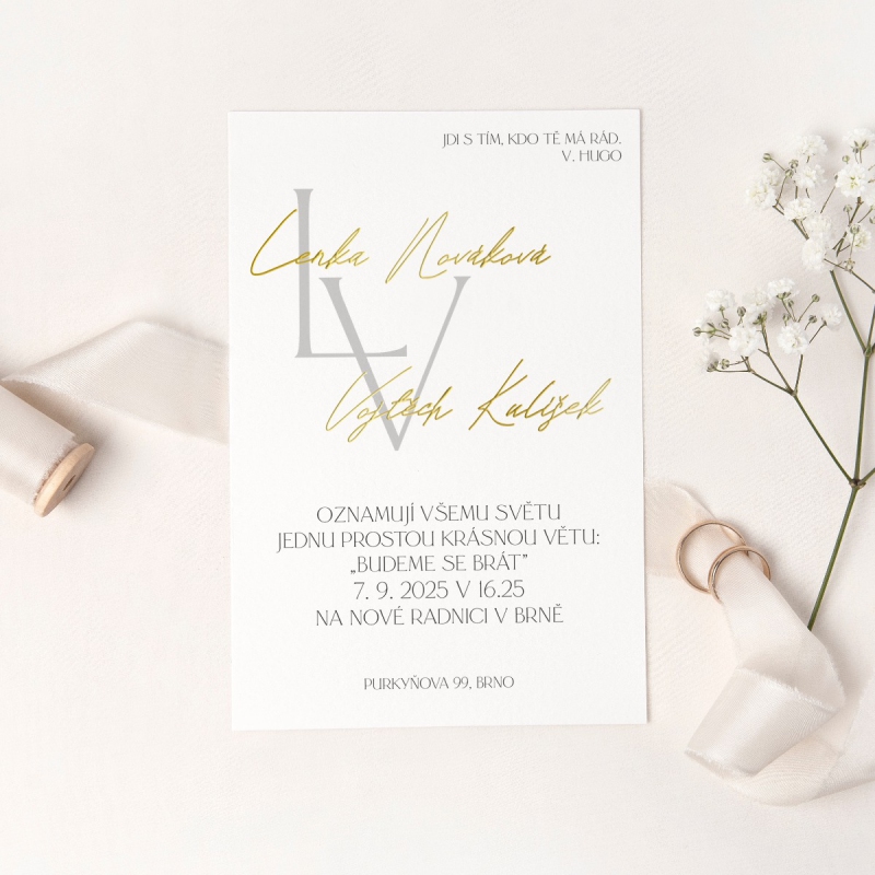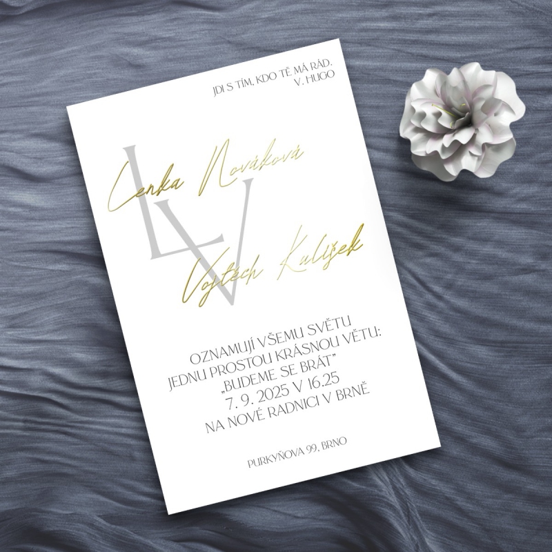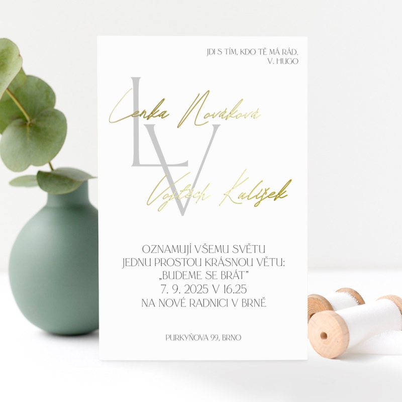 Originální svatební oznámení s moderním designem, metalickým textem nebo iniciály. U tohoto motivu je možné změnit také druh papíru dle nabídky.