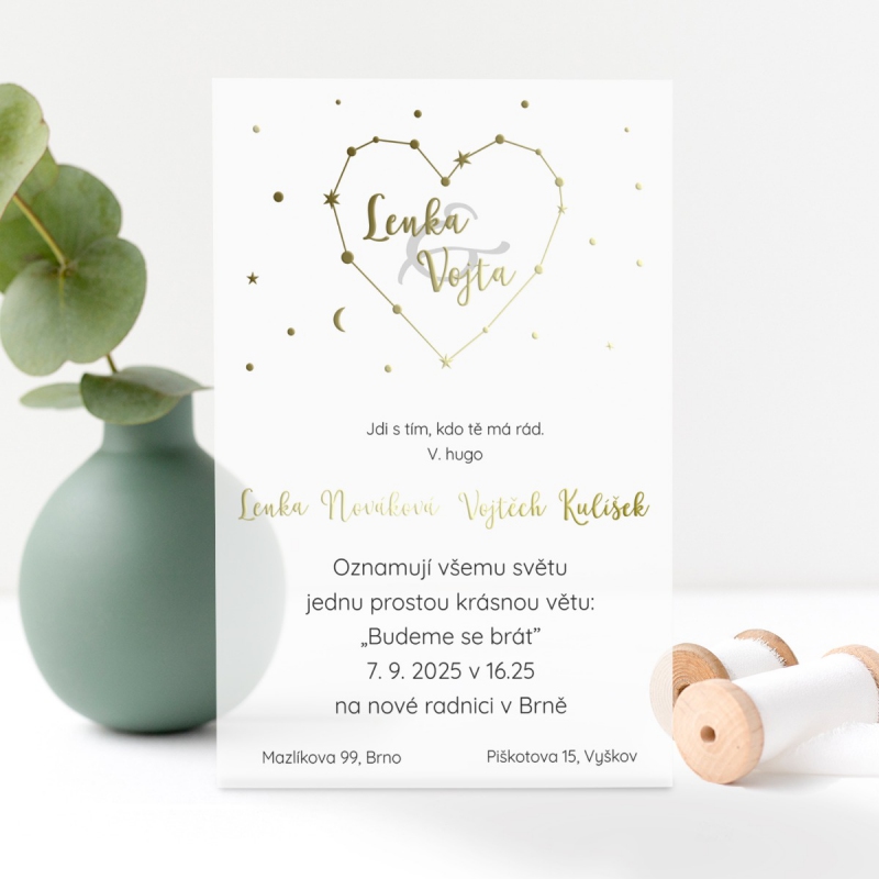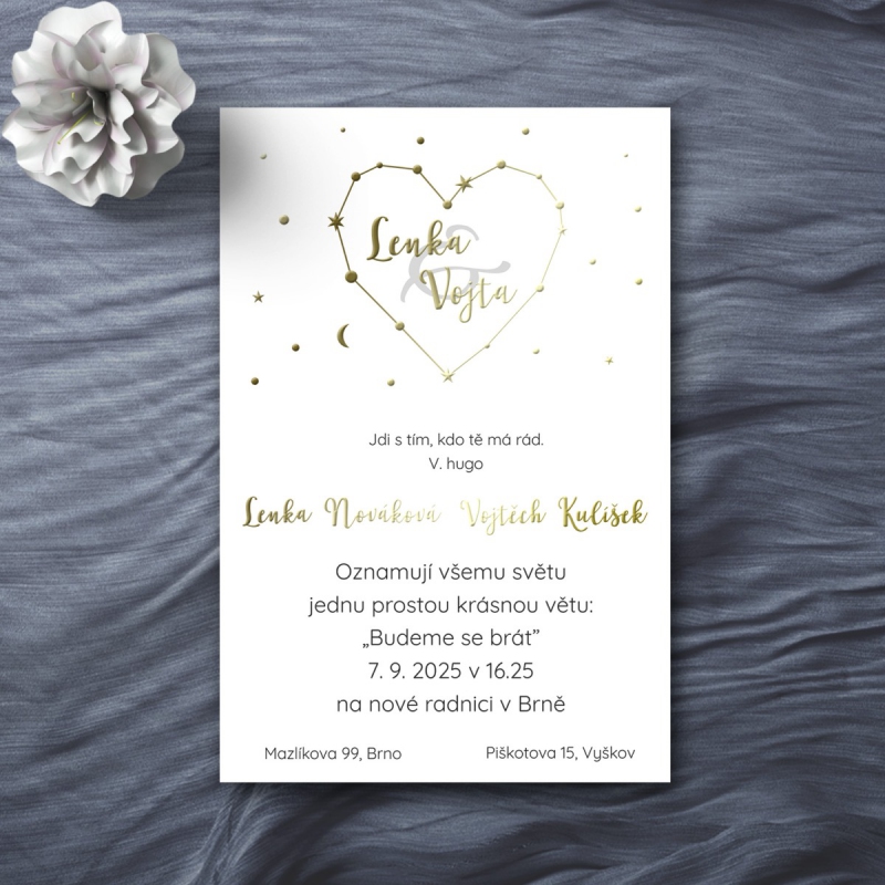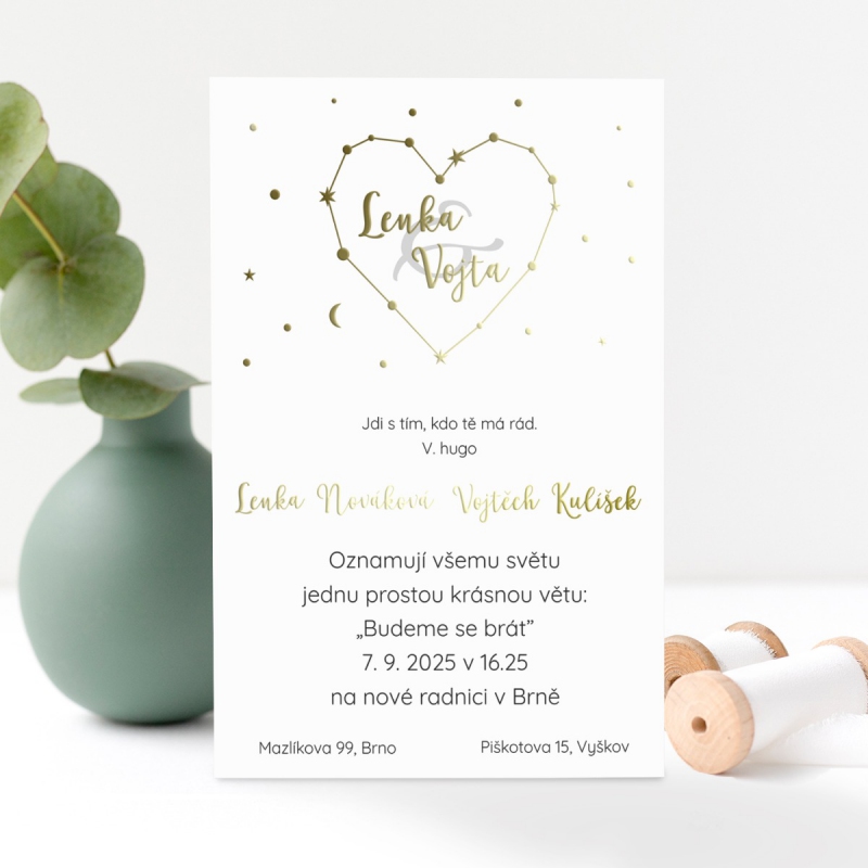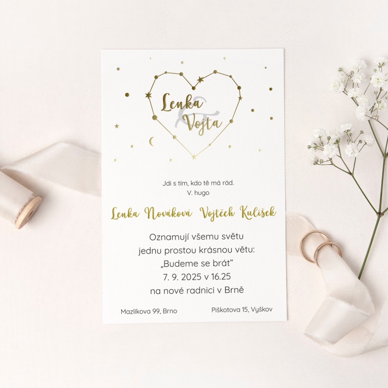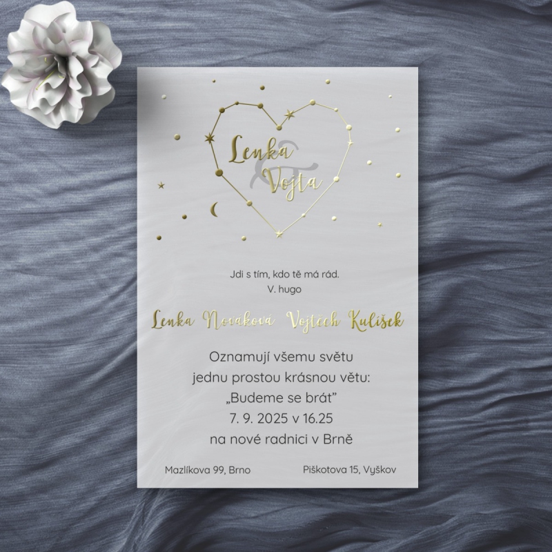 Originální svatební oznámení s moderním designem, metalickým textem nebo iniciály. U tohoto motivu je možné změnit také druh papíru dle nabídky.