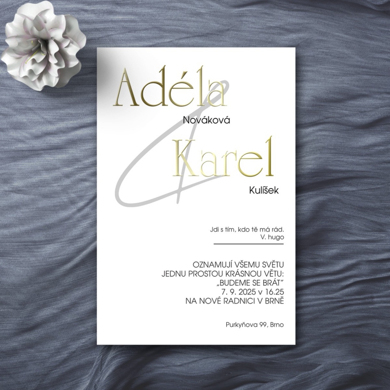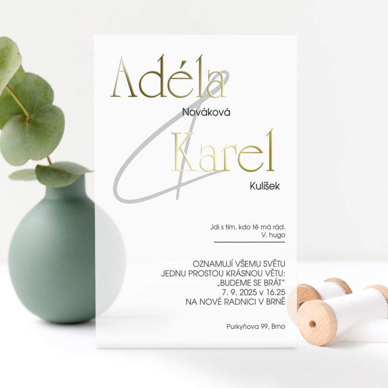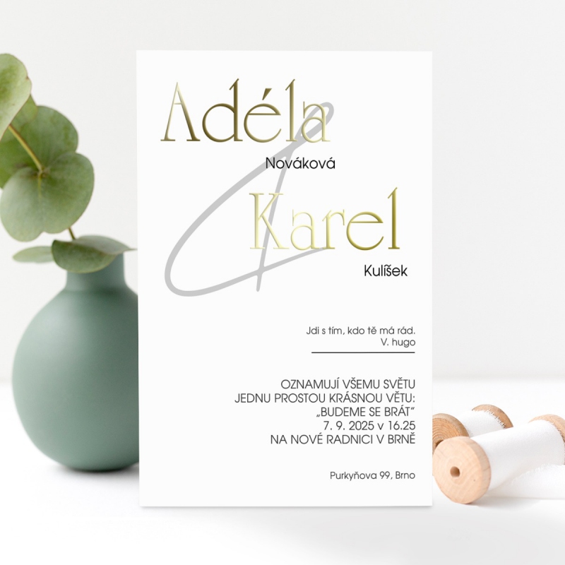 Originální svatební oznámení s moderním designem, metalickým textem nebo iniciály. U tohoto motivu je možné změnit také druh papíru dle nabídky.