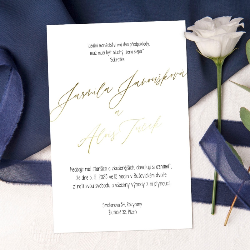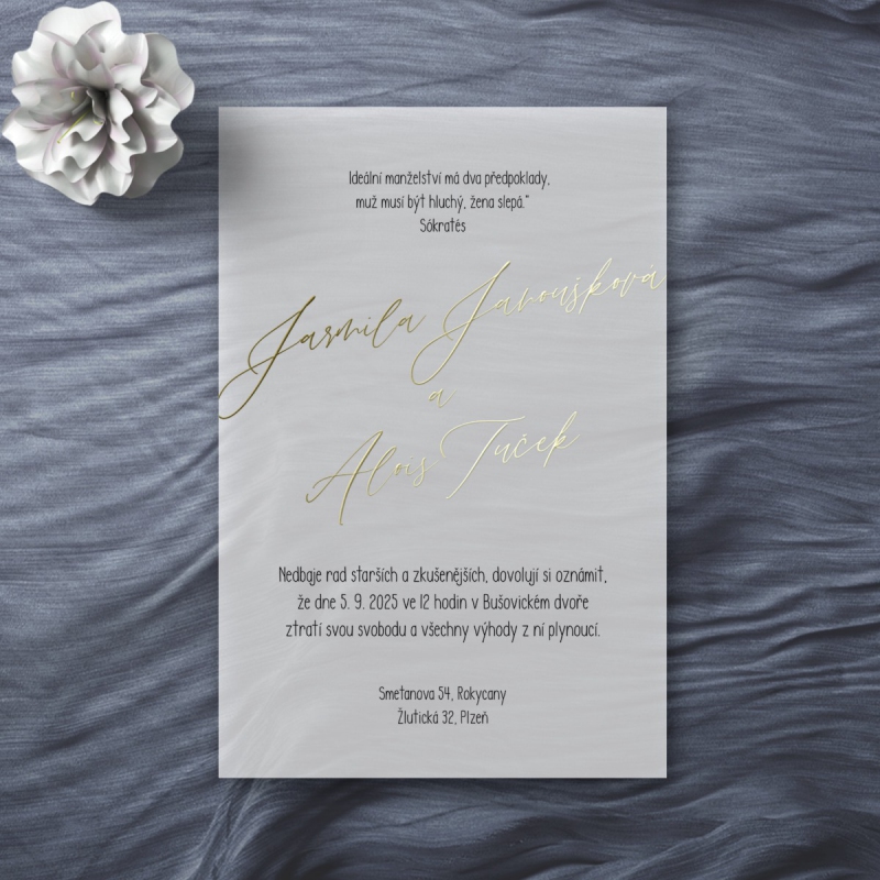 Originální svatební oznámení s moderním designem, metalickým textem nebo iniciály. U tohoto motivu je možné změnit také druh papíru dle nabídky.