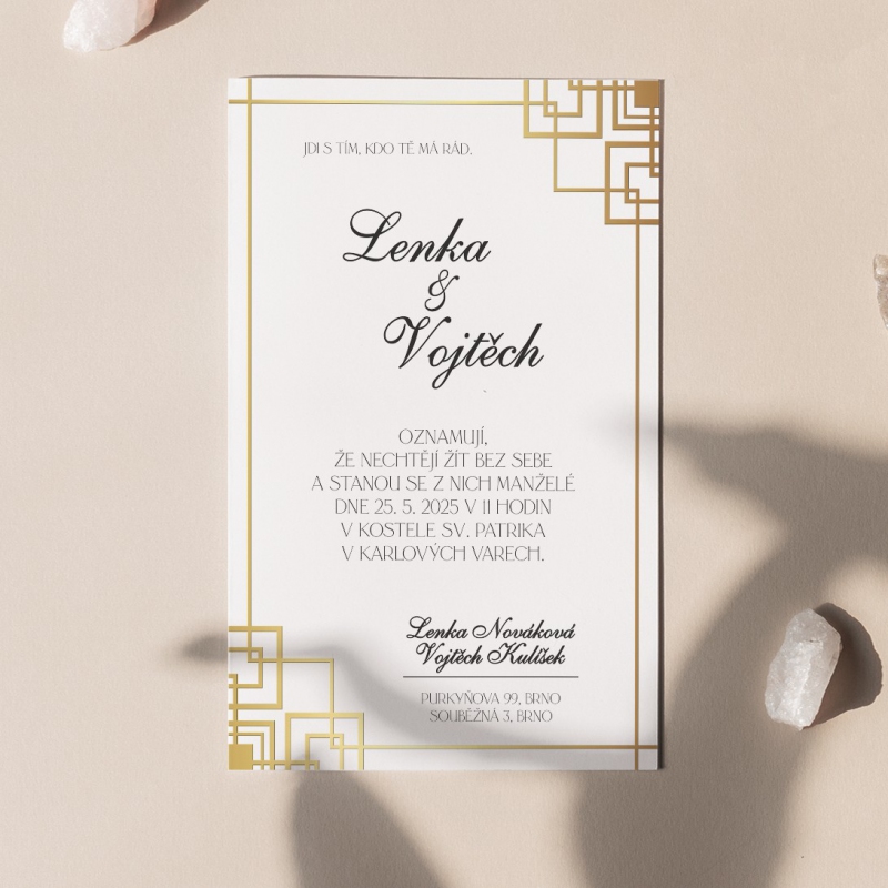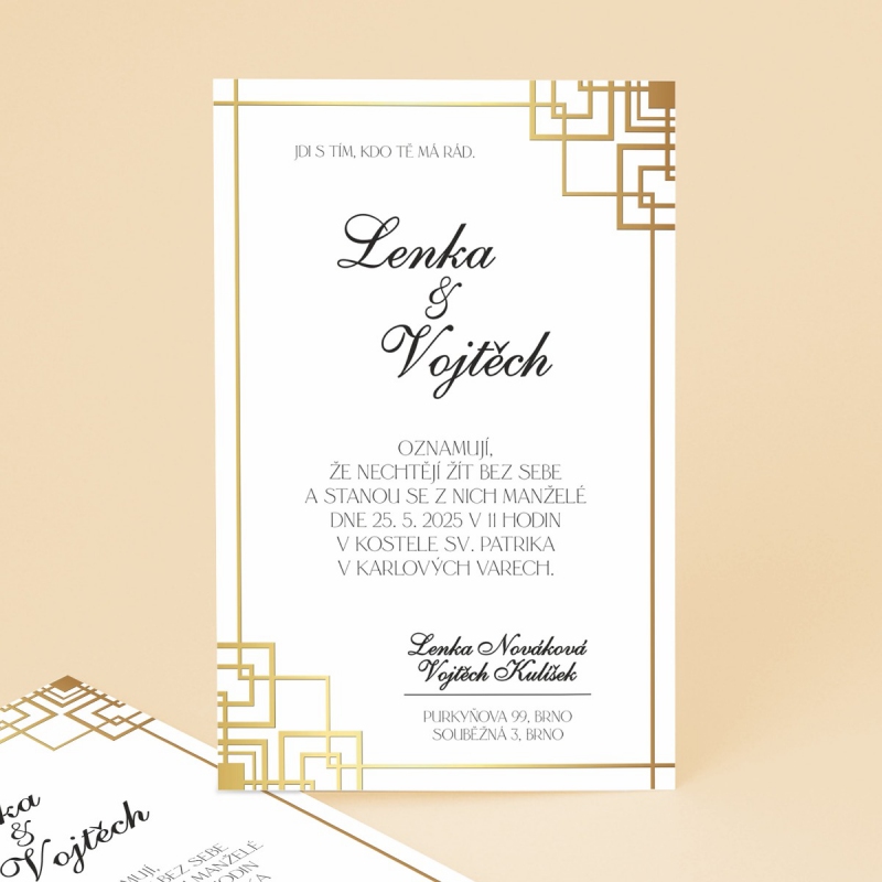 Originální svatební oznámení s moderním designem. Tisk na kvalitním papíru v gramáži 300g/m2 s povrchovou úpravou matného soft touch lamina.