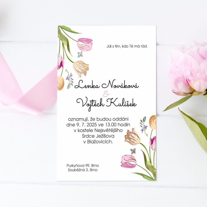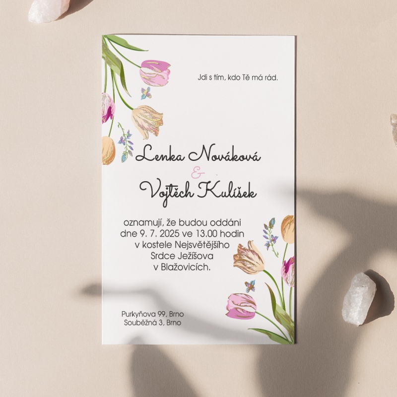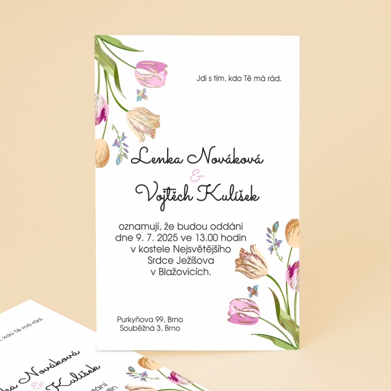 Originální svatební oznámení s moderním designem. Tisk na kvalitním papíru v gramáži 300g/m2 s povrchovou úpravou matného soft touch lamina.
