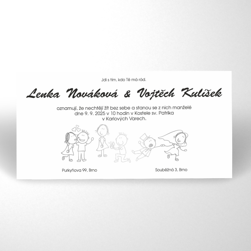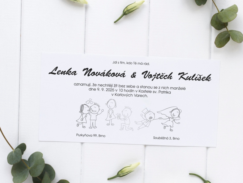 Originální svatební oznámení s moderním designem. Tisk na kvalitním papíru v gramáži 300g/m2 s povrchovou úpravou matného soft touch lamina.