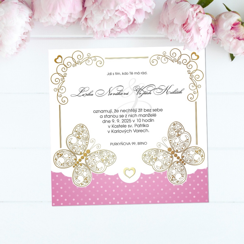 Originální svatební oznámení s moderním designem. Tisk na kvalitním papíru v gramáži 300g/m2 s povrchovou úpravou matného soft touch lamina.