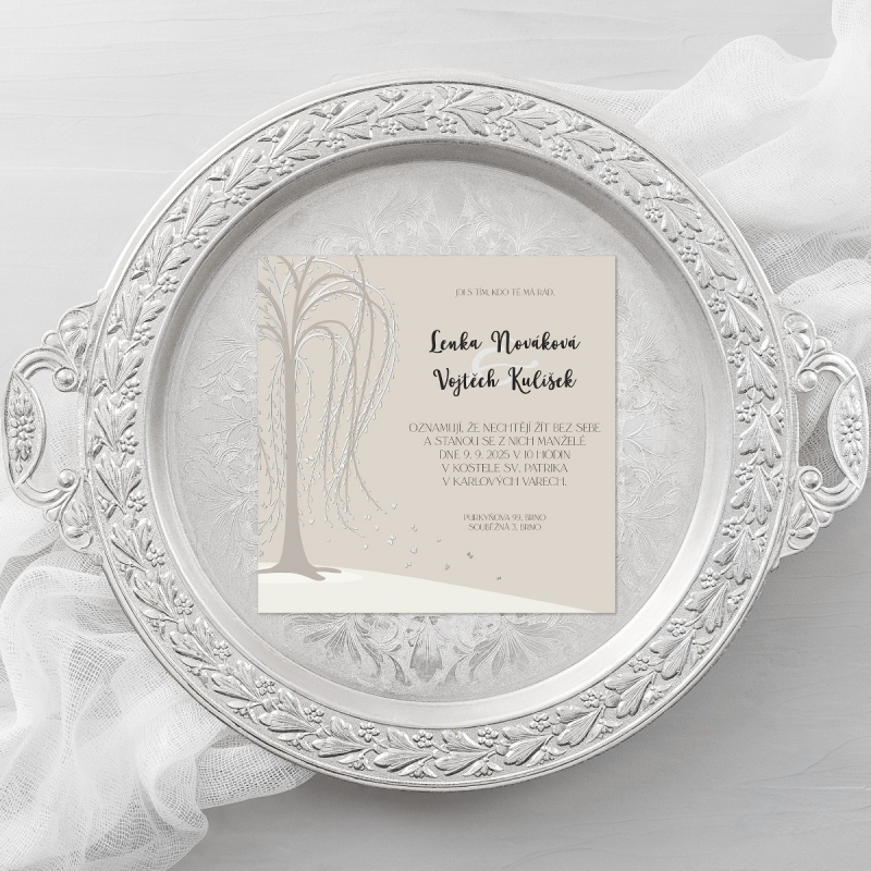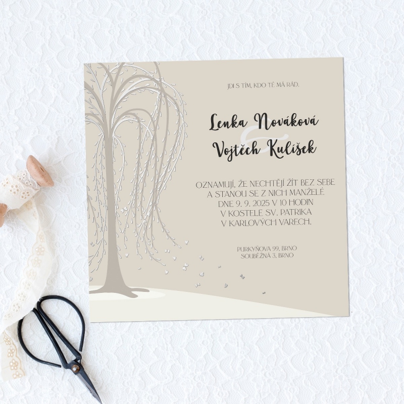 Originální svatební oznámení s moderním designem. Tisk na kvalitním papíru v gramáži 300g/m2 s povrchovou úpravou matného soft touch lamina.