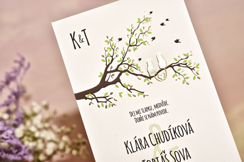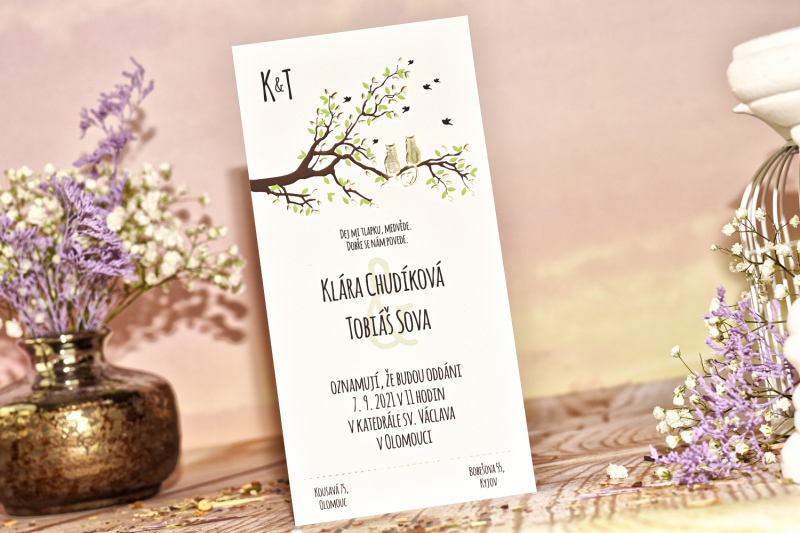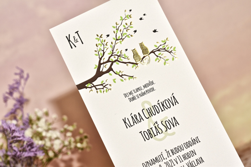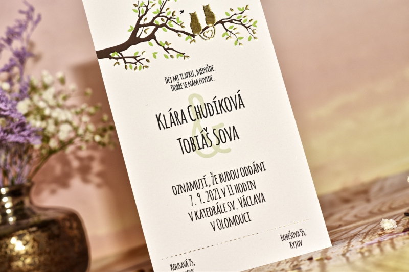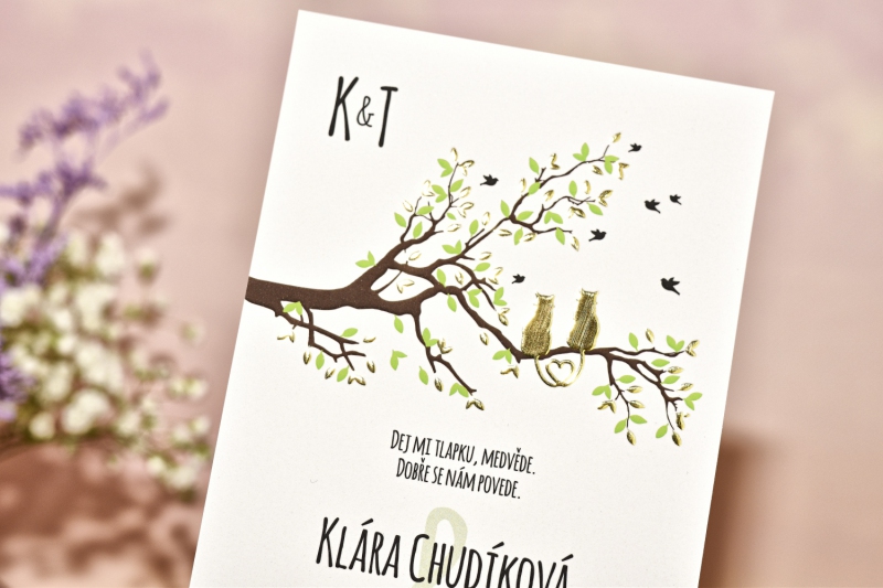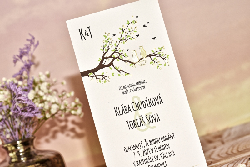 Originální svatební oznámení s moderním designem. Tisk na kvalitním papíru v gramáži 300g/m2 s povrchovou úpravou matného soft touch lamina.