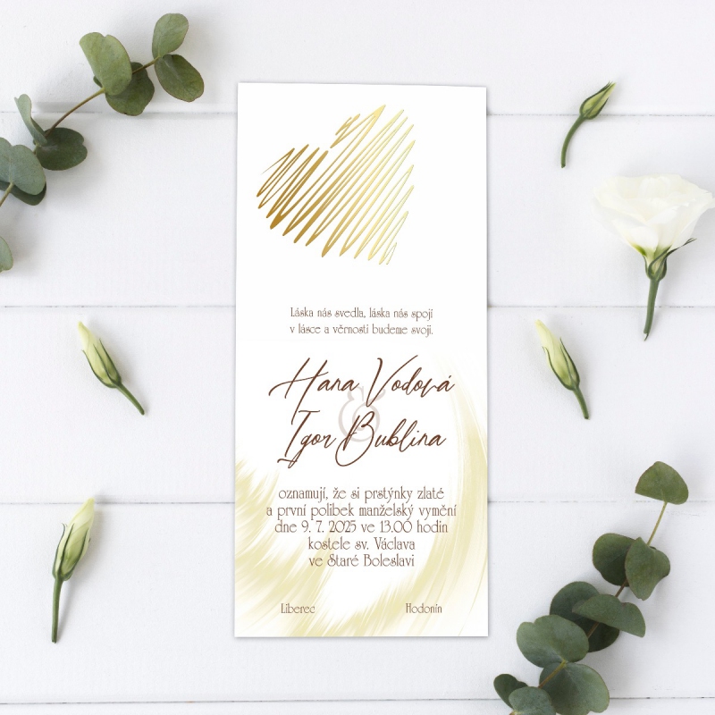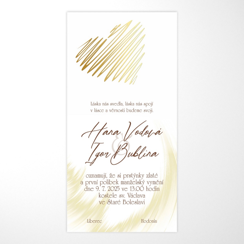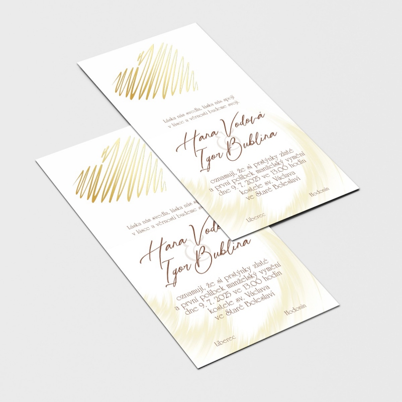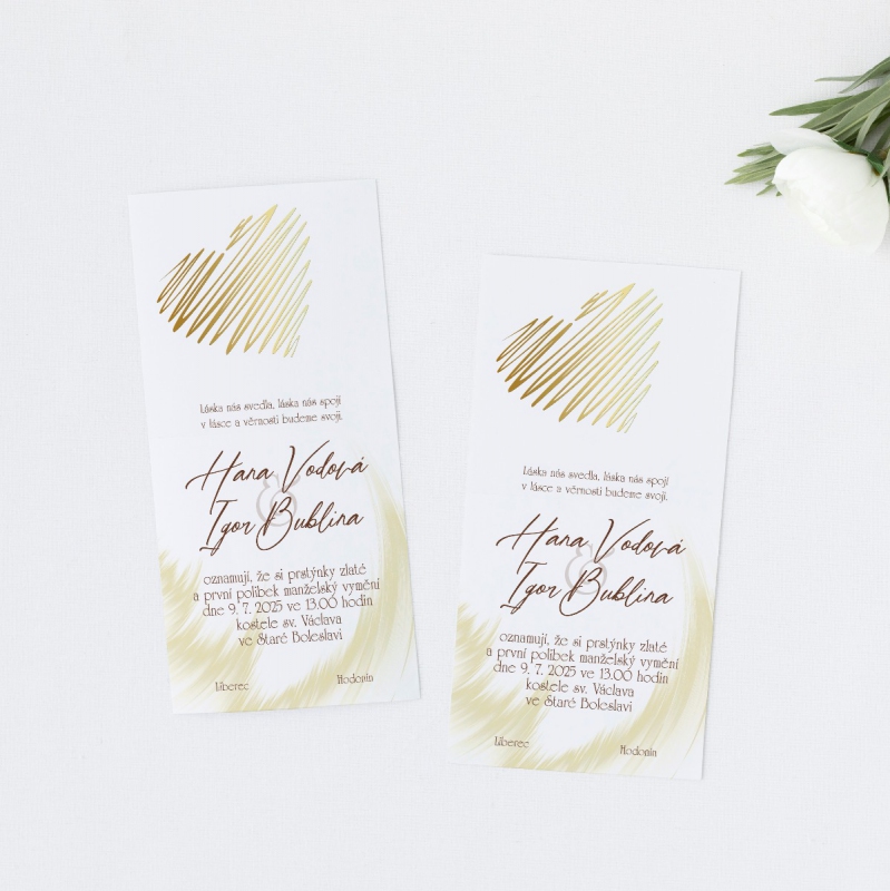 Originální svatební oznámení s moderním designem. Tisk na kvalitním papíru v gramáži 300g/m2 s povrchovou úpravou matného soft touch lamina.