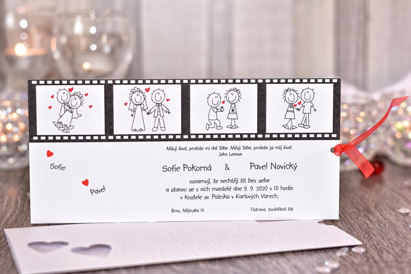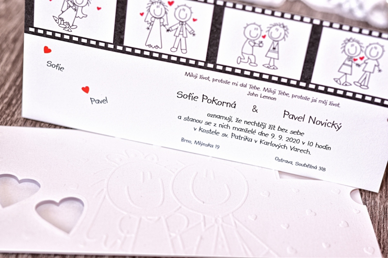 Originální svatební oznámení s moderním designem. Celek se skládá z přebalu, který je vyroben z kvalitního grafického papíru a vkladové karty na které je vytištěn Vámi požadovaný text.