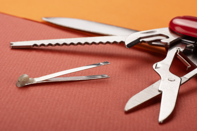 Kapesní nůž HIDI s červenou plastovou rukojetí. Tento přístroj má všechny potřebné funkce: nůž, pila, rybí škrabka, nůžky, otevírák konzerv, otevírák lahví, šroubovák, otvírák na víno, hrot a vyřezávač kůže.