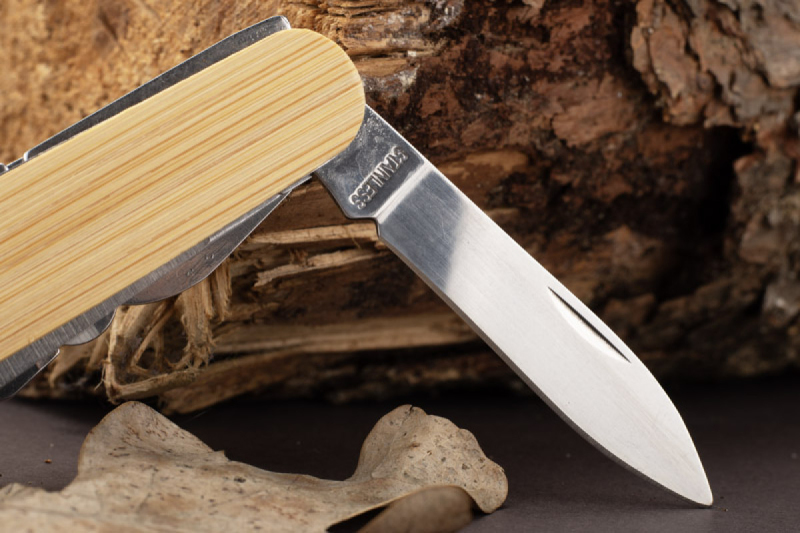 Kapesní nůž KANA s bambusovou rukojetí vyniká svým jedinečným, přírodním vzhledem. Vybaven funkcemi užitečnými jak v každodenním životě, tak i v terénu: nůž, pilka, škrabka na ryby, otvírák na konzervy a láhve, šroubovák, vývrtka, šídlo, děrovač na kůži a kroužek na klíče. Praktický reklamní předmět, který se hodí do každé situace.