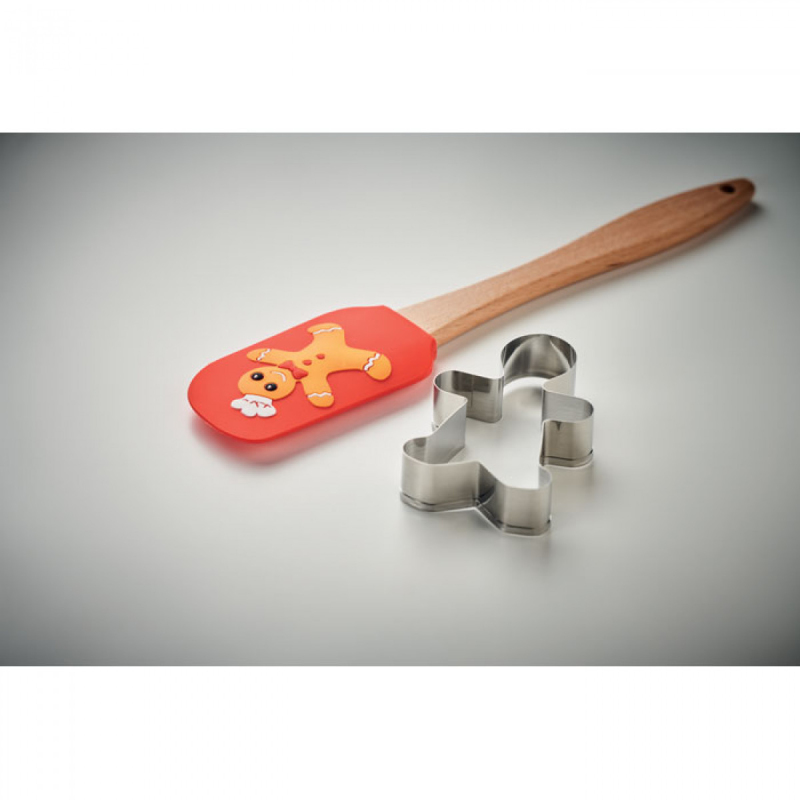 Sada na vánočního cukroví. Včetně 1 silikonové stěrky s motivem malého panáčka a dřevěnou rukojetí a nerezového vykrajovátka na cukroví.