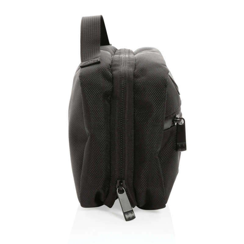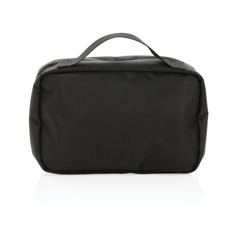 Praktická toaletní taška ideální pro cestovatele nebo elegantní uschování toaletních potřeb. Vyrobená z pevného recyklovaného polyesteru 1680D s bohatými detaily z umělé kůže. Dva prostorné oddíly na zip. Složení: vnější část: 100 % 1680D recyklovaný polyester; vnitřní část (podšívka): 150D recyklovaný polyester. Včetně skenovatelné složky AWARE™ garantující obsah recyklátu. Na výrobu bylo využito 10,14 500ml PET lahví a bylo uspořeno 6 litrů vody. Z výtěžku každého prodaného produktu je navíc přispěno 2 % na podporu iniciativy Water.org.