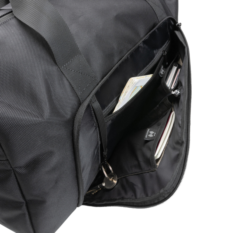 Elegantní skvěle vybavená taška ideální pro víkendové cestování. Vyrobená z pevného recyklovaného polyesteru 1680D s bohatými detaily z umělé kůže a množstvím kapes. Prostorný hlavní oddíl, vnitřní kapsa na zip, přední kapsa na zip s množstvím přihrádek, kapsy s RFID ochranou a odnímatelný kontaktní štítek. Složení: vnější část: 100 % 1680D recyklovaný polyester; vnitřní část (podšívka): 150D recyklovaný polyester. Včetně skenovatelné složky AWARE™ garantující obsah recyklátu. Na výrobu bylo využito 50,7 500ml PET lahví a bylo uspořeno 30,2 litrů vody. Z výtěžku každého prodaného produktu je navíc přispěno 2 % na podporu iniciativy Water.org.