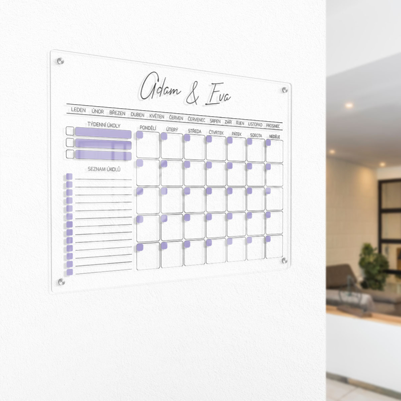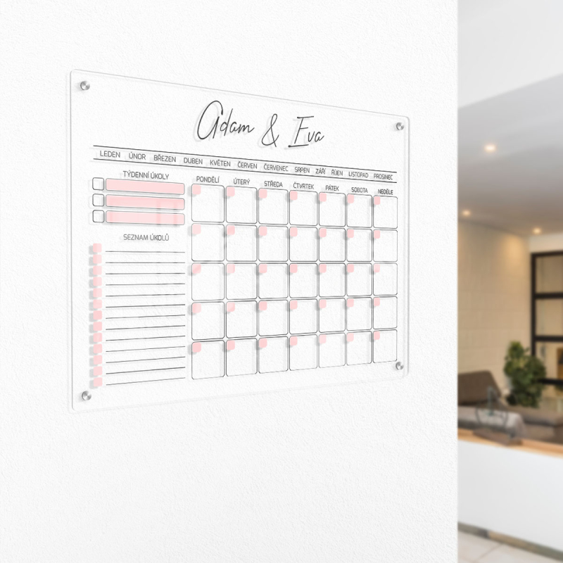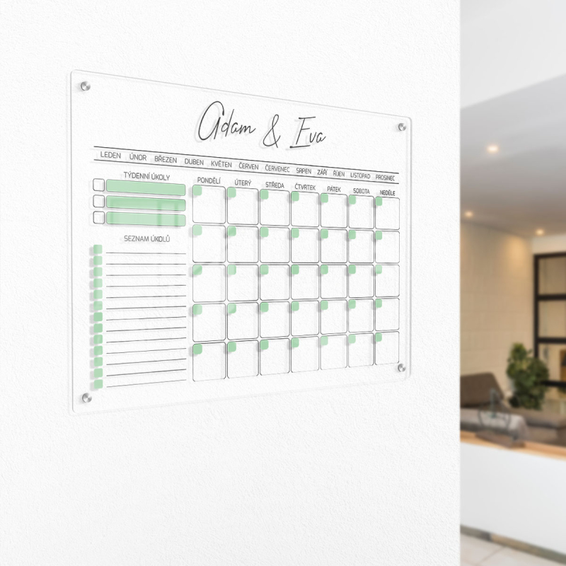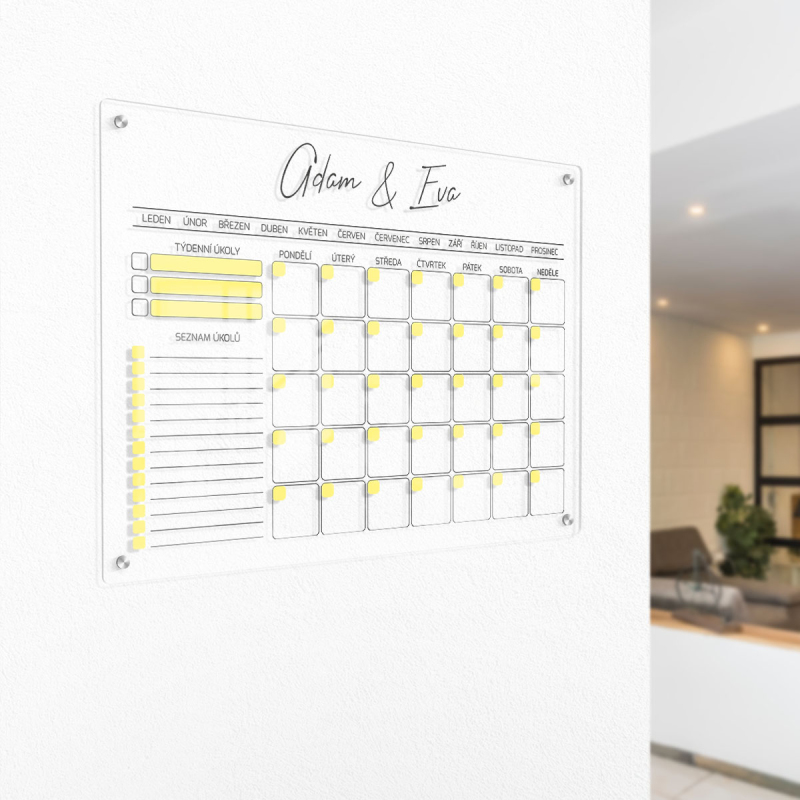 Tabulka s úkoly z akrylového skla je skvělým pomocníkem pro přehlednou organizaci domácích prací a všech volnočasových aktivit. Potisk desky je proveden kvalitním UV tiskem ve vysokém rozlišení až pod akrylovým sklem. Díky tomu je vyhotovený potisk chráněn před mechanickým poškozením z pohledové strany a zároveň je možné na desku psát bez rizika z poškození originálního potisku.