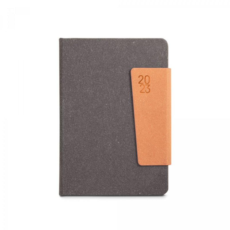 A5 diář z recyklované, kůže (58%) s magnetickým uzavíráním. Organizovaný do denního plánu. S držákem na kuličkové, pero (včetně) a stuhou na označení stránky. Dodává se s netkaným obalem. 148 x 210 mm | Obal: 205 x 250 mm