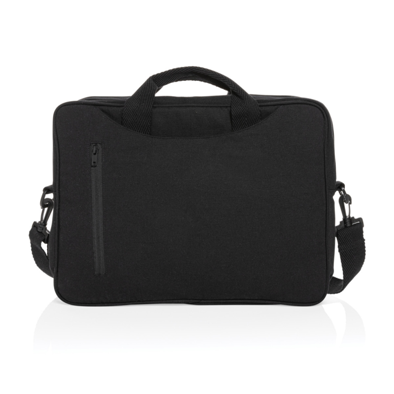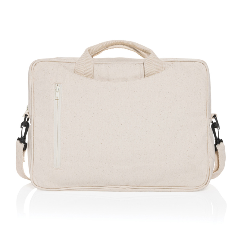 Stylová taška vyrobená z recyklovaného bavlněného kepru. Gramáž tkaniny: 340g/m2. Polstrovaný oddíl pro až 15,4" notebook se zapínáním na suchý zip, praktická přední kapsa, pohodlná ucha a přizpůsobitelý ramenní popruh pro pohodlné nošení. Vyrobeno z recyklované bavlny včetně skenovatelné složky AWARE™ garantující obsah recyklátu. Z výtěžku každého prodaného produktu je přispěno 2 % na podporu iniciativy Water.org.