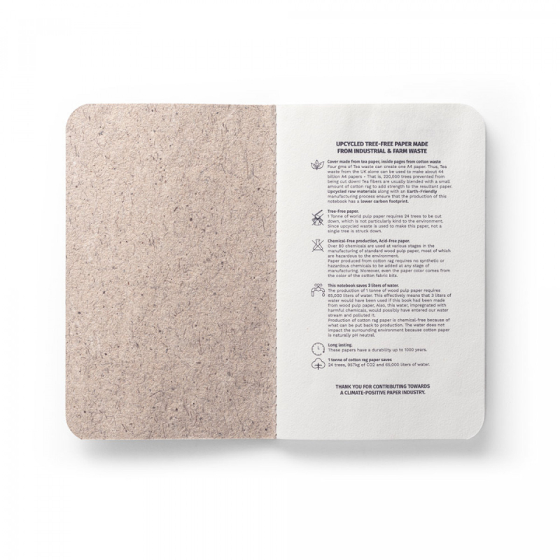 Poznámkový blok A6 s pružným krytem vyrobený z odpadu z čajových listů. Vnitřní papír je vyroben z bavlněného odpadu a je vysoce odolný. Obsahuje 52 obyčejných stran a papírový pás s kresbou. Ve výrobním procesu tohoto poznámkového bloku nevznikl žádný odpad ani nebyly použity žádné chemikálie nebo zničeny stromy. 100 x 145 mm