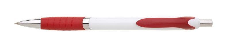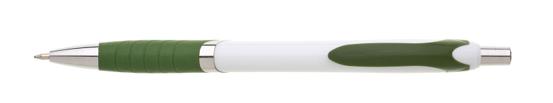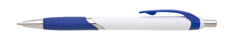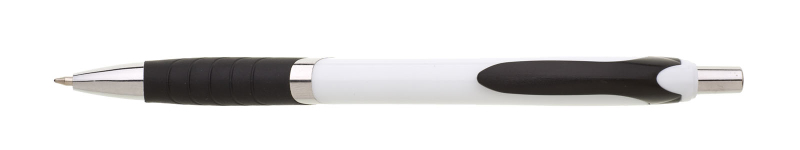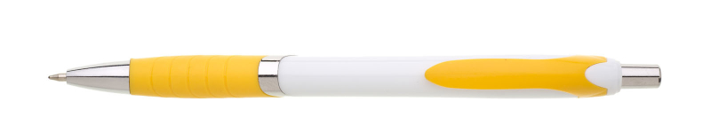 Plastová propiska s bílým tělem s žlutým úchopem a klipem a stříbrnými doplňky.