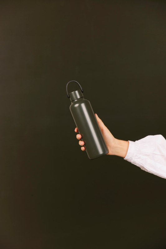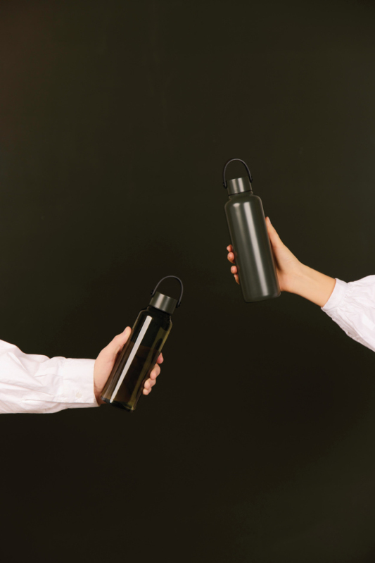 Stylová dvoustěnná vakuová láhev je vyrobená z RCS certifikované recyklované nerezové oceli. Je navržena s minimalistickým PU držadlem a černými detaily. Nápoje udrží studené až 12 hodin a teplé až 6 hodin. Není vhodná do myčky ani do mikrovlnné trouby, pouze ruční mytí. Certifikováno RCS (Recycled Claim Standard), certifikace RCS zaručuje, že celý dodavatelský řetězec recyklovaných materiálů je certifikován. Celkový obsah recyklovaného materiálu je založen na celkové hmotnosti výrobku. Tento produkt obsahuje 80 % RCS certifikované recyklované nerezové oceli.