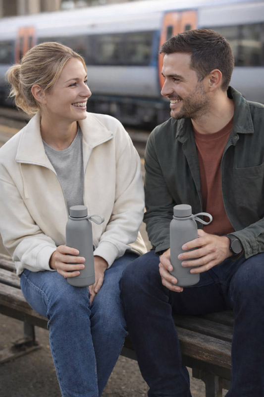 Termo láhev NUVIO o objemu 500 ml je vyrobena z nerezové oceli s dvojitou stěnou a vakuovou izolací, která udrží nápoj horký až 14 hodin. Pogumovaný povrch soft touch jí dodává příjemný pocit a moderní vzhled, zatímco silikonové držadlo usnadňuje přenášení. Klasický uzávěr se závitem zajišťuje těsné uzavření. Jedná se o praktickou termo láhev do kanceláře, na cesty i pro každodenní použití.