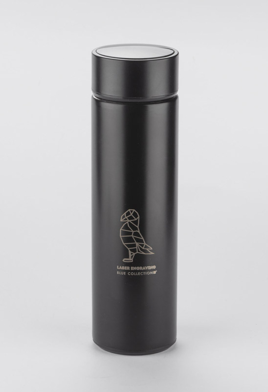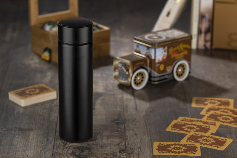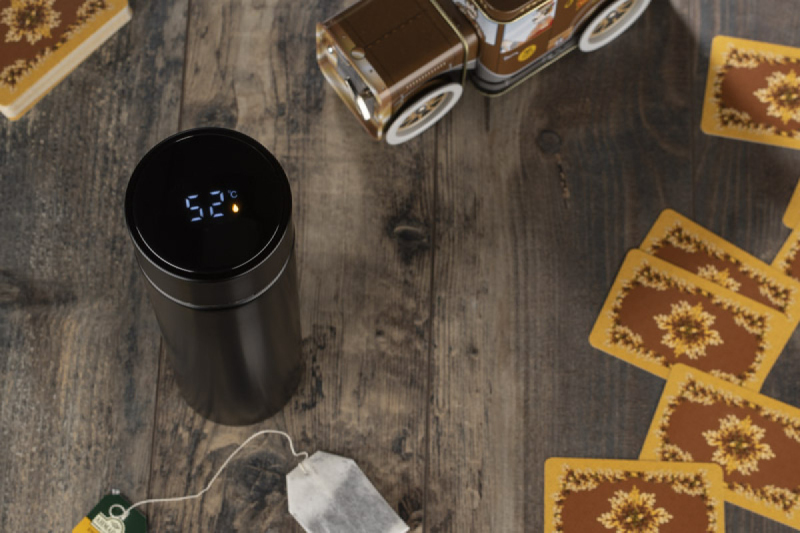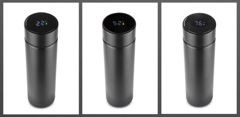 Termální láhev THERMO je velmi zajímavá. Kombinuje klasickou funkci termosky a elektroniky v podobě dotykového digitálního teploměru zabudovaného do víčka. Stačí otočit lahvičku dnem vzhůru na 10 sekund a přečíst nejpřesnější teplotu nápoje. Navíc se zobrazí ikona kapiček, která mění barvu v závislosti na teplotě: červená, když je nápoj horký, zelená, když je bezpečné pít, a modrá, když je studená. Díky vakuu mezi stěnami udržuje teplotu asi 13 hodin. Vyrobeno z nerezové oceli 304. Uvnitř je sítko, díky kterému můžeme vařit čaj.